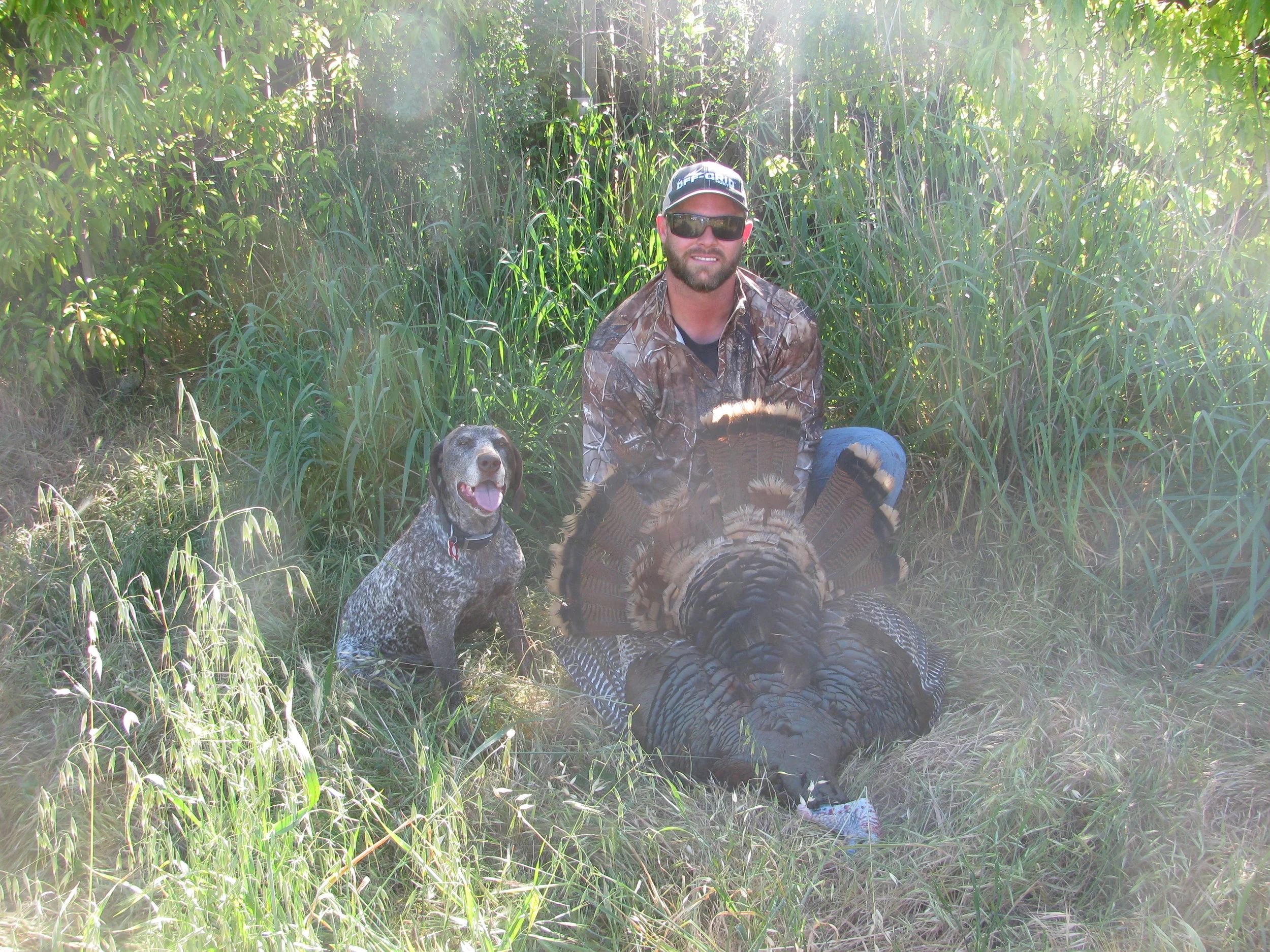 This 2015 spring turkey season was no exception however, it has been one for the books. I truly feel blessed to have harvested all three of my turkeys this year with my bow. I wish I could say it was easy, but each hunt proved to be difficult in its own way. On one of the hunts I made what I thought was a perfect shot right in the center of the wing only to find out that it wasn’t a kill shot. I tracked the bird for a few hours just to end up kicking it up and pushing it further into the thick brush. I ended up having to go to work, but returned eight hours later with my pointer. I figured my bird dog could find anything, and as luck would have it, she found my wounded bird in a matter of minutes. However, it was still alive and running. Fortunately for me, my pointer loves fast food and she made quick work in stopping the turkey long enough for me to catch it. Fun hunt, but not easy.